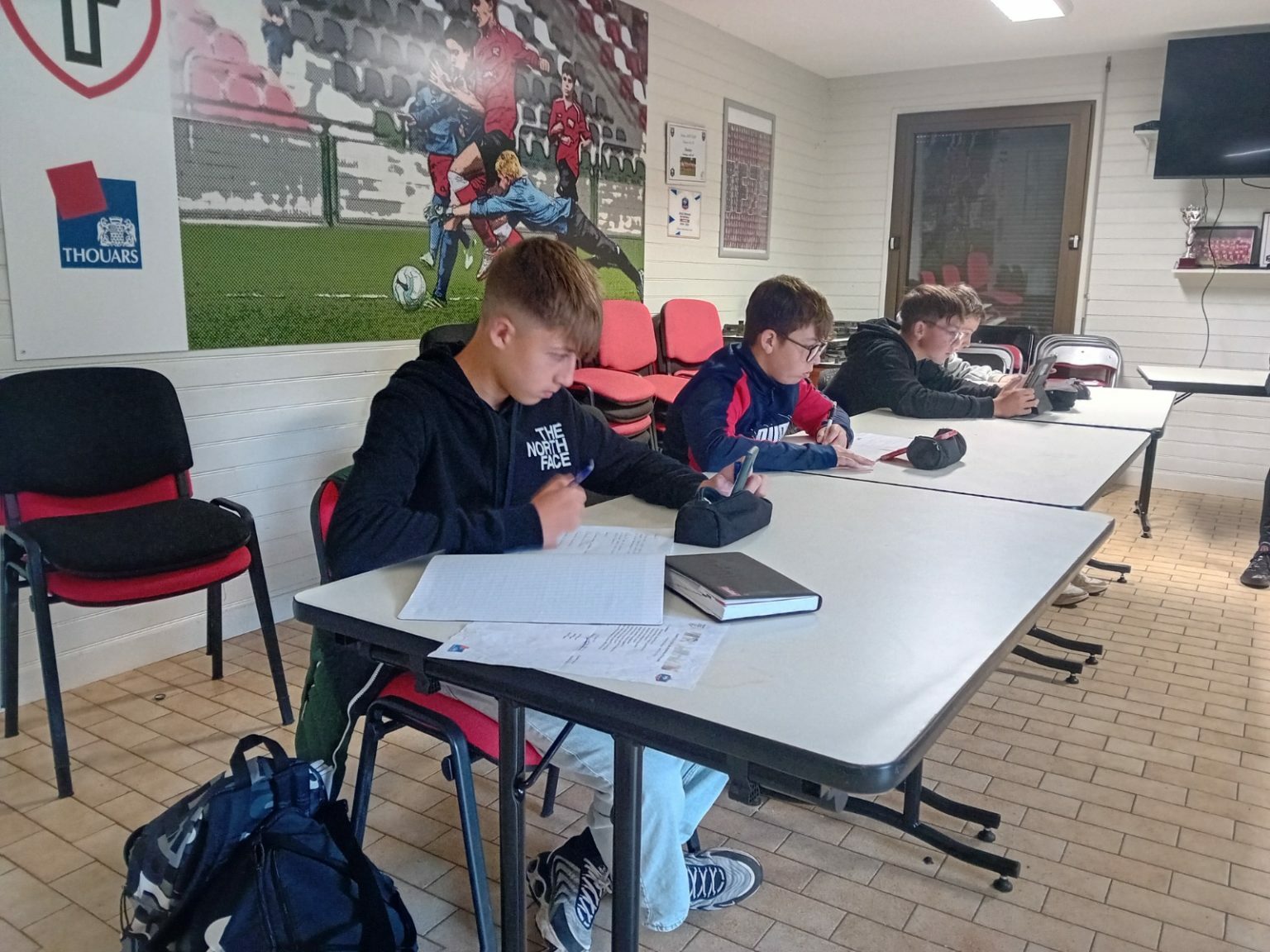 En complément du service de navettes, nous avons aménagé un espace dédié dans le club house où les jeunes peuvent faire leurs devoirs avant leurs séances d’entraînement. Cette initiative a pour objectif d’encourager les joueurs à réussir à la fois sur le terrain et dans leurs études. L’aide aux devoirs est proposée les lundis et mardis soirs, afin de permettre aux enfants de réviser et de se concentrer dans un environnement calme et encadré avant de rejoindre le terrain.